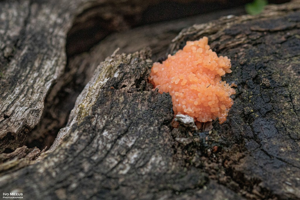 Sporangia dicht opeengedrongen, zittend, in 1 tot meer dan 5 cm brede groepen, ongesteeld, cylindisch of knotsvormig, Ø 0,3 mm, tot 5 mm hoog, bleek- tot donkerbruin of rood- tot purperbruin. Plasmodium oranje, roze of vermiljoen, vaak in roze tot roze-oranje, aardbei-achtige plasmodiumklompjes.