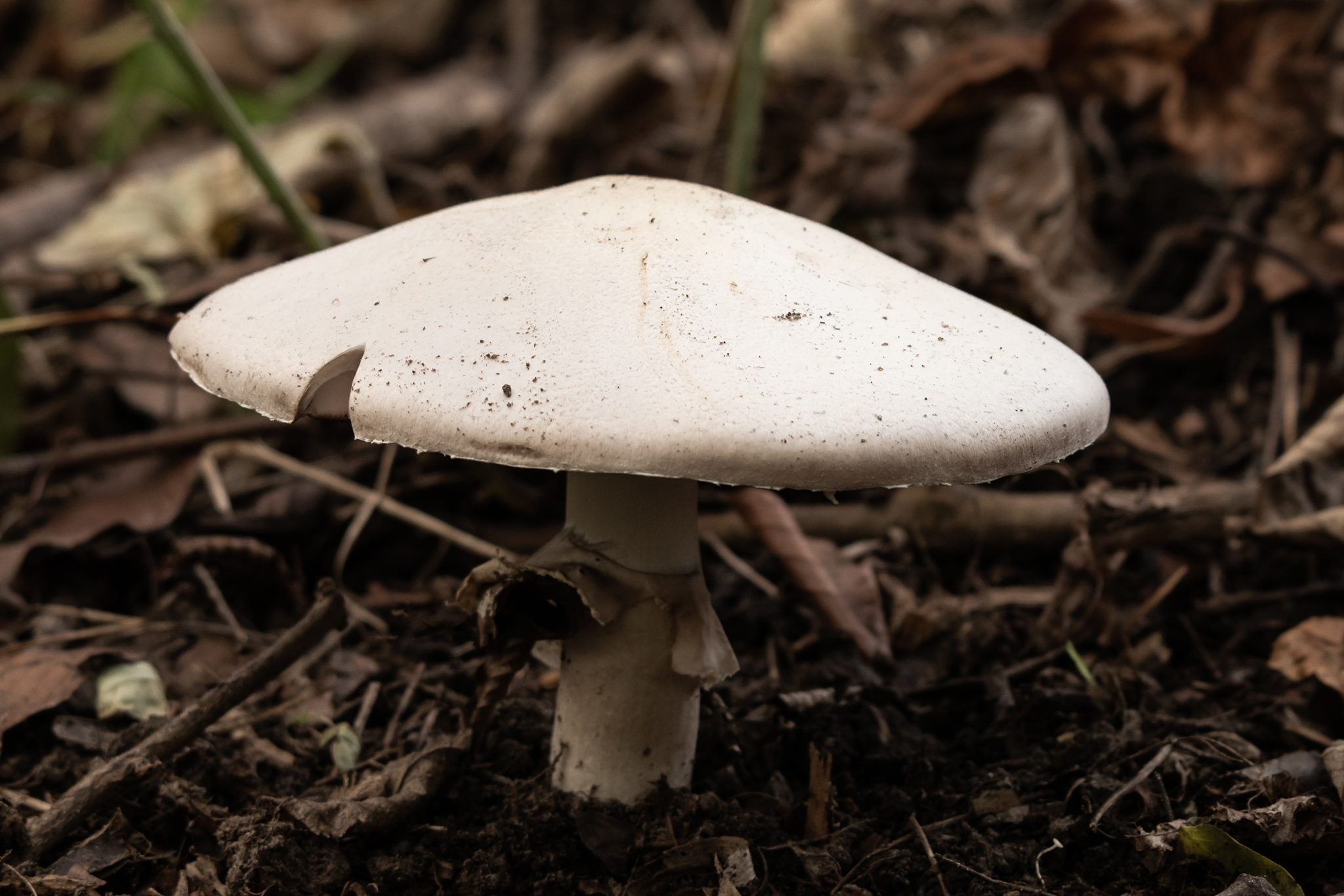 Steel 5-15 x 1-2 cm, wit, met een witte ring en een verdikte basis. Vlees wit, chroomgeel verkleurend in de steelvoet. Smaak onaangenaam. Geurt naar karbol.